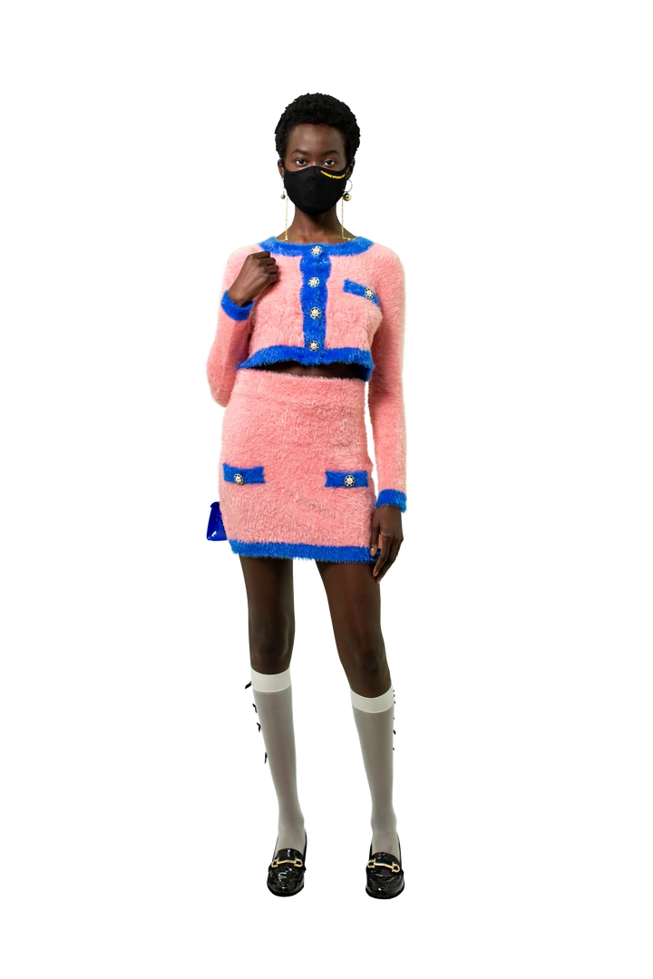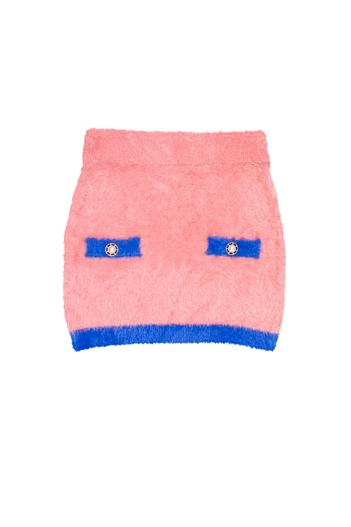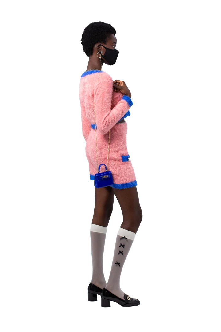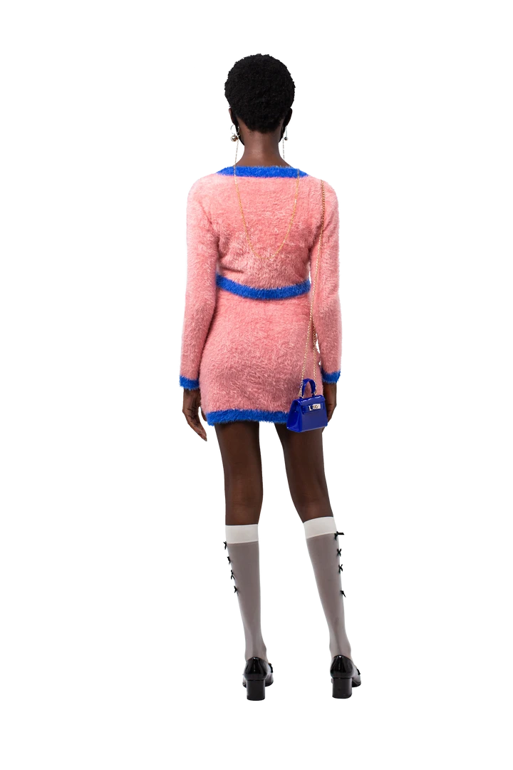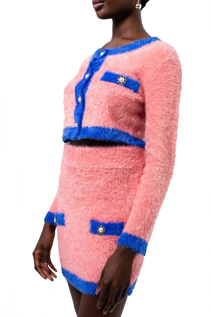 Soft, fluffy, and perfectly cropped for maximum comfort with a hint of edge. This lil pink/blue combo will make heads turn and hearts spin.